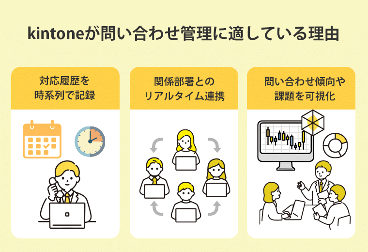 こうした課題の解決策として有効なのが、業務アプリをノーコードで柔軟に構築できるkintoneの活用です。kintoneでは情報の一元管理だけでなく、可視化・分析・連携といった多角的なアプローチが可能になります。ここでは特に問い合わせ管理においてkintoneが優れている3つの理由について詳しく紹介します。