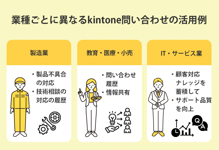kintoneによる問い合わせ管理の仕組みは業種を問わず幅広い現場で活用されています。ただし実際の運用方法や管理すべき情報の内容は業種によって異なります。