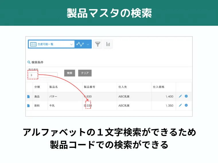 - よく検索する項目をあらかじめ設定、検索窓に入力すればデータ一発表示