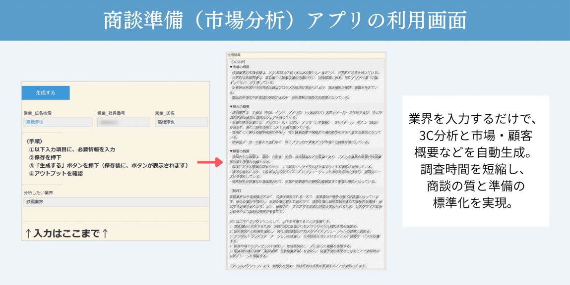 業界理解に生成AIをうまく活用できる人もいます。ただ、ごく一部であり、全員が使いこなせるわけではありません。そこで、kintoneとSmart at AIを連携させた「業界分析専用のアプリ」をリリース。「鉄鋼業界」など知りたい業種を入力するだけで、3C分析の結果や市場動向などが30秒で表示される仕組みを構築しました。プロンプトを意識せずに使えるため、生成AIに苦手意識を持っていた方にも一気に広がっていきました。